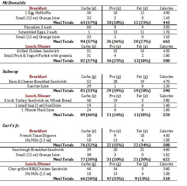 Youth athletes don’t have to follow “strict” diets, but fueling properly before and right after games and practices will help developing athletes maximize performance, recovery and muscle growth.(1,2)  Ideally, the meal eaten two and a half to three hours before events and practices should be high in carbohydrates with moderate protein and fat.(3)  Meals high in fat, fiber or protein eaten before activity can interfere with energy levels, slow digestion and cause an upset stomach. Listed below are good fast food choices from common restaurants and general guidelines for when you’re on the go.